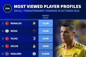 10月德转球员页面浏览量排名:C罗居首,梅西、伊尔迪兹二三位