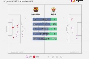 体育资讯11月3日讯 2025-26赛季西甲第11轮,埃尔切客场1-3不敌巴萨。本场比赛,埃尔切控球率达到了51%。